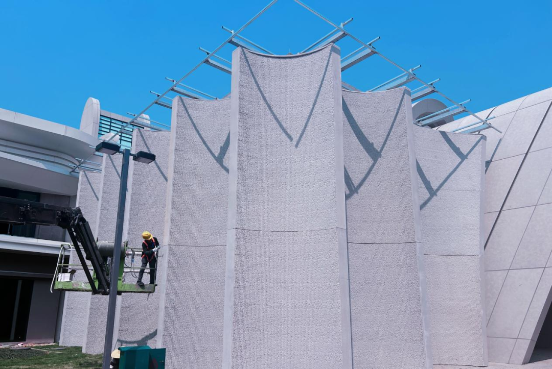 本項目采用的是剔鑿條紋效果的UHPC曲板,它通過模擬手工剔鑿的紋理,增強了面板的立體感、原始感。UHPC超高性能混凝土材料不僅能提升建筑外觀的藝術(shù)性和觀賞性,更通過其卓越的耐久性和穩(wěn)定性為建筑提供長期的保護。